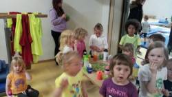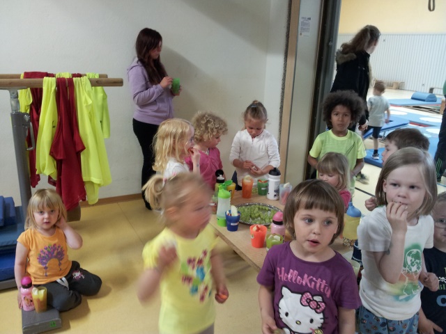 Mittags um 15:00 Uhr trafen Ann-Kathrin, Martin und ich uns in der Halle um noch einige Vorbereitungen zu treffen. Wir stellten für jedes Kind einen Becher mit Gemüse (Karotten, Paprika, Kohlrabi), sowie Platten mit Trauben und Bananen auf einen kleinen Tisch.