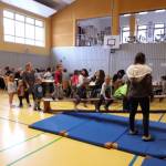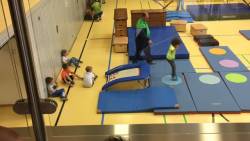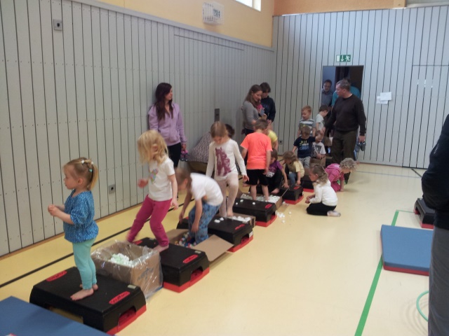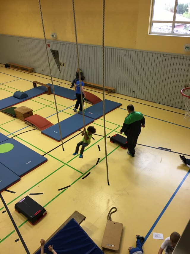 Dann konnten die Kinder zeigen wie fit sie sind, sie mussten über den großen Schwebebalken, an den Ringen schaukeln und dabei Bälle, die sie mit den Knien festhielten in einen Kasten werfen, das Löwengehege durchkämpfen, wie Kängurus von verschieden hohen Kasten und vom Trampolin springen, sich mit langen Seilen, die von der Decke hingen, von Stepp zu Stepp schwingen und zum Schluss, sich unter einer erhöhten Matte(lag auf zwei Bänken) mit dem Rollbrett am Seil entlang durchziehen.