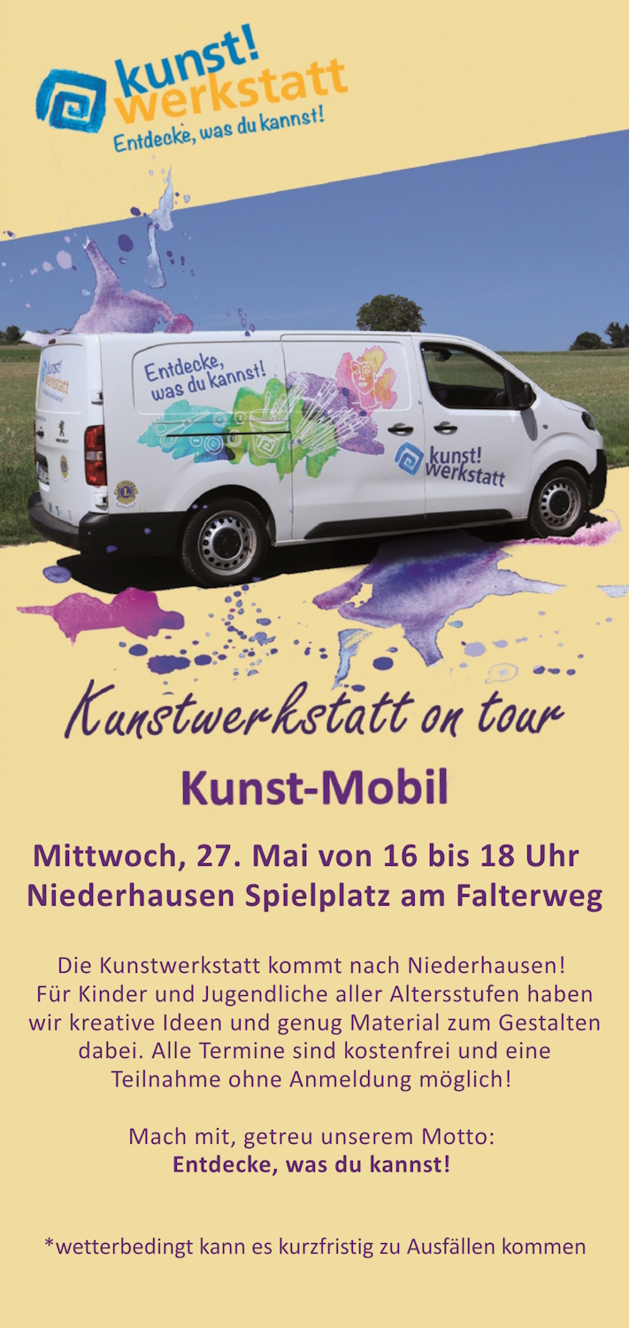 Die Kunstwerkstatt kommt nach Niederhausen! Für Kinder und Jugendliche aller Altersstufen haben wir kreative Ideen und genug Material zum Gestalten dabei. Alle Termine sind kostenfrei und eine Teilnahme ohne Anmeldung möglich!