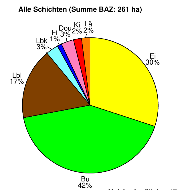 Fast unverändert sind etwa 90 % Laubholz und ca. 10 % Nadelholz anzutreffen, wichtigste Baum Arten bleiben Buche und Eiche (nunmehr 42 % und 30 %). Mit dieser Baumartenverteilung ist der Gemeindewald gut an die oligo-mesotrophen, mäßigen-trockenen Standortbedingungen und an mögliche Veränderungen im Zuge des Klimawandels angepasst.